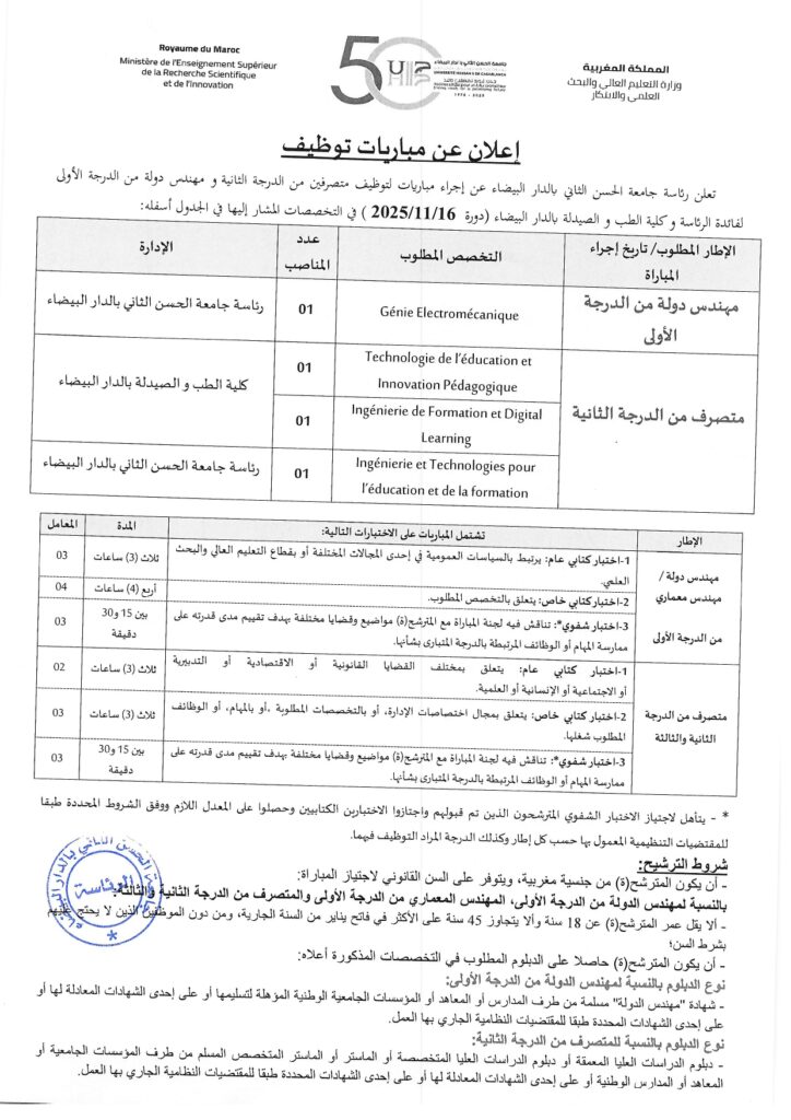 أعلنت رئاسة جامعة الحسن الثاني بالدار البيضاء عن إجراء مباريات توظيف لشغل مناصب في إطار مهندس دولة من الدرجة الأولى و متصرف من الدرجة الثانية، وذلك لفائدة الرئاسة وكلية الطب والصيدلة بالدار البيضاء. تُجرى هذه المباريات في 16 نوفمبر 2025، ويمكن للراغبين في الترشح تقديم طلباتهم عبر المنصة الإلكترونية المخصصة قبل تاريخ 7 نوفمبر 2025.